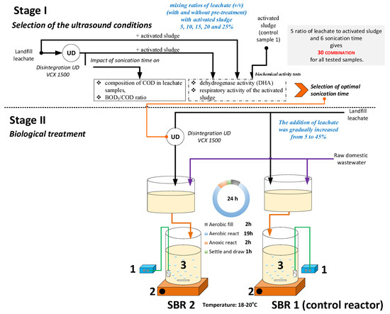 The optimal conditioning time was selected based on the values of COD, BOD5/COD ratio as well as results of biochemical activity tests performed for the activated sludge. In the 2nd stage, two identical laboratory-scale SBRs with a working volume of 3 L were used for the examination of leachate ultrasound pretreatment on biological treatment efficiency. The SBR systems were operated at feeding condition of leachate dilution of up to 45% by volume with raw domestic wastewater and sludge concentration of 4 g/L. Samples were withdrawn from the reactor at the beginning and at the end of each cycle for analysis. The scheme of the experiment is shown in Figure 1.