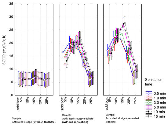 Results of biochemical tests are shown in Figure 2 and Figure 3. The values of both parameters strongly depended on the share of leachates in the mixtures regardless of the method of preparing the leachate (with or without pretreatment). For both parameters, the highest values were observed for samples containing 15% of leachate. For activated sludge with non-conditioned leachate the SOUR was approximately 22 mgO2/g·h and thus was 250% higher than the values noted for the reference sample (an average for 30 samples: 6.28 ± 0.43 mgO2/g·h). After increasing the share of leachate in the mixture, the percentage increment of SOUR in comparison to the reference sample decreased to 120%, while for the highest volumetric ratio of leachate to wastewater, it did not exceed 8%. A similar trend was observed for activated sludge with pretreated leachate. However, the obtained values were significantly higher than those achieved for activated sludge with non-conditioned leachate. Significant differences in SOUR occurred in the mixtures containing 20% and 25% of leachate which was sonicated for 5, 10 and 15 min. In the case of these samples, the percentage increment of SOUR values was about 200% and approximately 50%, respectively.