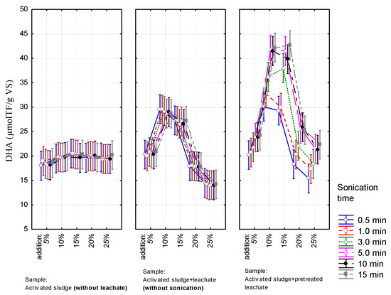 Similar trends like in the case of SOUR were observed for the DHA activity. With prolongation of sonication time, the difference in DHA values between samples increased (with and without pretreatment). The highest percentage increment of dehydrogenase activity (approx. 110% in comparison to the reference sample) was observed for the samples containing 10% and 15% of leachate in the mixture at an ultrasound field exposure duration of above 5 min. These values were significantly higher than those obtained for the reference sample as well as activated sludge with non-conditioned leachate. It should be emphasized that for the trials for leachate without conditioning, the DHA activity was lower than in the reference sample. This proves the positive effect of conditioning on the condition of activated sludge.