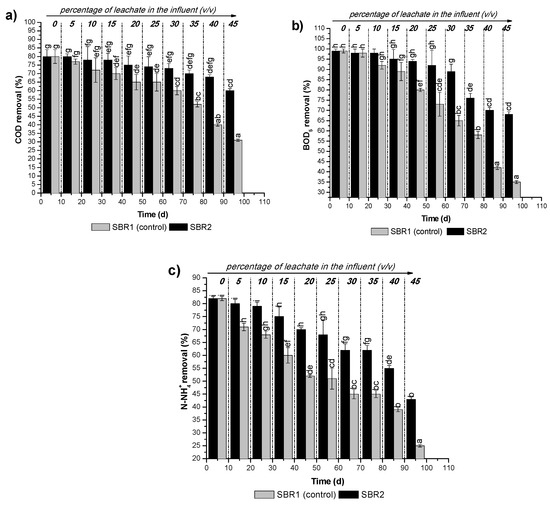 As depicted in Figure 4 in both SBRs the removal efficiency of COD, BOD as well as ammonium nitrogen decreased with the increase of leachate in the influent. However, regardless of the ratio of leachate in the effluent (%, v/v), the treatment efficiency was higher for SBR2 (pretreated leachate) than SBR1 (control). Thus, the execution of a pretreatment step prior to biological treatment allows to reduce the negative impact of the leachate on the removal degree for the tested parameters. This result is in agreement with the findings of El-Gohary and Kamel [7]. The mentioned Authors observed low COD and BOD removal values, 37.1 and 30.3%, respectively for intermediate leachate (BOD/COD ratio was in the range of 0.33–0.45) mixed with municipal wastewater in a ratio of 1:1. However, after pretreating the leachate via air stripping, they observed significantly increased COD and BOD removal values of up to 64.4 and 67.2%, respectively.