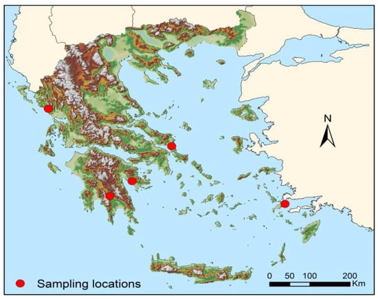 Soil samples were collected from five areas over Greece and more specifically from the Prefectures of Evia (49 samples), Lakonia (12 samples), Preveza (7 samples), Argolida (90 samples) and from the island of Kos (40 samples) at the depths of 0 to 15 cm (Figure 1). The soils were under different crop cultivations or non-cultivated and represent soils of different soil salinity levels. Also considered to be representative of irrigated soils.