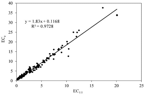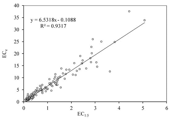 Visconti et al. [11] presented ECe = f(EC1:5) relationships for soils with gypsum mass percentage between 0.2–1.5% and >1.5%. For the case where gypsum mass percentage is less than 0.2% the ECe = f(EC1:5) is strongly linear.