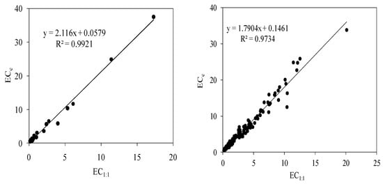 The ECe = f(EC1:1) relationship according to the value of SP. In the left, values of SP are between 20–45% and in the right for SP > 45%.