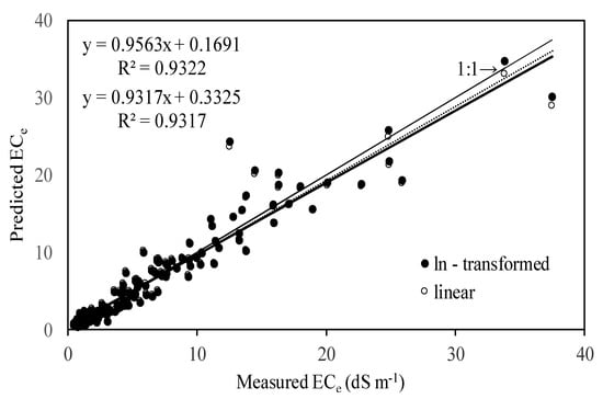 In Figure 5 the comparison is shown between the predicted ECe values, as these were obtained by an ln-transformed model (ln(ECe) = f(ln(EC1:5)) and the predicted ECe values, as these were obtained by the linear model (ECe = f(EC1:5), against the actually measured ECe values. From Figure 5 it is shown that the predicted ECe values, as these were obtained by an ln-transformed model are very close to the 1:1 line and give better results than those obtained by the linear model. It is to be noted that a strong linearity was obtained in the ln-transformed model, as this was also reported by He et al. [12] for each one out of the four examined cases of equilibrium, concerning EC1:5 determination (data not shown). It is to be reminded that in their work the majority of their soil samples (67%) had SP values in the range 20–45% while in the present work in this range only the 15.1% were included. Therefore, the ln-transformed model seems to have a general validity for all soil types and in this sense, it is a reliable methodology for the estimation of ECe from the EC1:5 measurements.