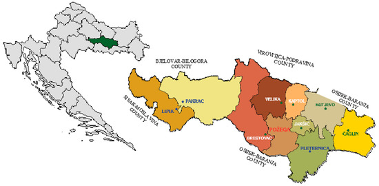 The case study area is located in Požega-Slavonia County (north-eastern part of Croatia, Figure 1), in the sub-catchment area of river Orljava that belongs to the Sava River Basin [19]. The Orljava River basin consists of valleys, terraces, and hills, mostly covered with forests, meadows and cultivated areas.