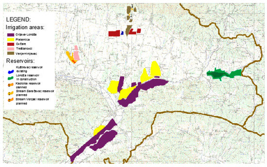 Planned irrigation areas (alternatives) in the 1st phase are Orljava and Londža, Pleternica, Ovčare, Treštanovci, and Venje-Hrnjevac (Figure 2).