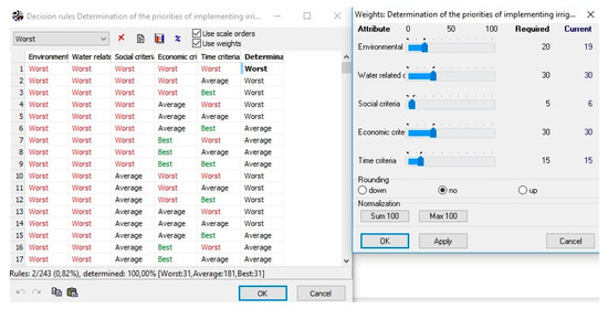 It can be concluded that the adequacy of using DEXi method when determining priorities in fulfilling irrigation plans can be confirmed. The analyzed method gives the opportunity for development of the complex structure of various criteria and their weighting factors in an easy way and short time period. The use of qualitative measures must be emphasized as an important advantage of DEXi method in cases where it is difficult to give quantitative evaluations of alternatives. Further research should include a more detailed comparison with other MCA methods.