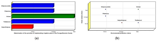 The “economic” criterion covers the total cost of the irrigation systems (the cost of designing the project and all needed documentation and the cost of building the whole system in Croatian currency Kuna-kn) divided by the size of the irrigated area, sorting alternatives in three classes: 0 to 24,999.99 (best); 25,000.00 to 55,000.00, and over 55,000.00 kn/ha (worst). The weight for the “economic” criterion is 30%.