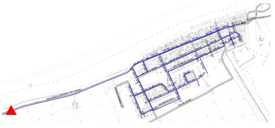 Diagram of the water distribution network of Gorino Ferrarese (FE). The red triangle indicates the point where the DMA’s inlet discharge and pressure are monitored.