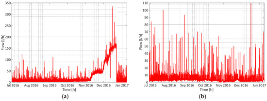 With reference to the users, the combined analysis of the time series of the cumulated volume and hourly discharge of each user was performed in order to characterize the leak level. This analysis made it possible to identify different types of leaks, which differ for size and behaviour: from large leaks caused by broken pipes (Figure 4a), to small leaks produced by incorrect functioning of sanitary appliances (Figure 4b).