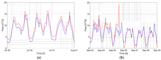 More specifically, during the observation period between the end of June 2016 and the end of March 2017, a total of 211 water leaks were identified: 26 corresponding to leaks greater than 10 L/h, 101 corresponding to leaks between 1 and 10 L/h and 84 leaks smaller than 1 L/h. With reference to the Water Utility, the district water balance was carried out throughout the entire observation period. This analysis was carried out by comparing the time series of the discharges entering the DMA with the time series obtained by adding the discharge time series of each user. The analysis made it possible to characterize the leak level in the distribution network over time. For instance, the Figure 5a, illustrates the water balance for three days in July 2016. It shows that during the summer 2016, the profile of the discharge entering the DMA (indicated in red in Figure 5a) has the same trend of the consumption of all users (in blue) but is always higher. The difference between the two profiles is an almost constant value of about 1.5 m3/h. Only after the consumption peak, measured exclusively by the meter at the entrance of the DMA (indicated in red in Figure 5b) on 5 September 2016, there is a change in the discharge entering the DMA.