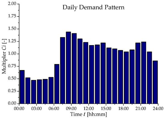The procedure proposed above was applied to a WDN serving 20,000 inhabitants, with average flow rate Qtm = 57.9 L/s and maximum flow rate Qt,max = 83.3 L/s. The daily demand pattern provided by [9] and plotted in Figure 1 was considered. Two Scenarios were simulated, at varying the available head as summarized in Table 1. A horizontal centrifugal PAT was assumed in the example. For any scenario, a value of 0.5 kW was set as the minimum produced power. For lower produced power, the exploitation of the head drop Ht,av was assumed.