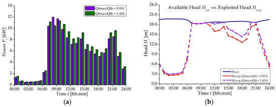 By applying the procedure mentioned above, results obtained by setting Qtmax/Qtb = 1.450 were summarized in Table 1 and compared with those from Qtmax/Qtb = 0.951. It was observed lower values of the design parameters (Qtb, Htb, D and N), resulting in a lower maximum power Pt,max = 10.5 kW, but a greater daily produced energy Ed = 146.14 kWh/day. Due to the exploitation of heads higher than the available ones, the power maximization is unfeasible at several time steps (07:00, 09:00–11:00, 14:00, 21:00–22:00); in such cases, the rotational speed N able to exploit the available head was set. At time steps 07:00, 09:00–11:00, the produced power resulted higher than that at Qt,max, as a consequence of the higher available head against lower Qt but, however, close to Qt,max.