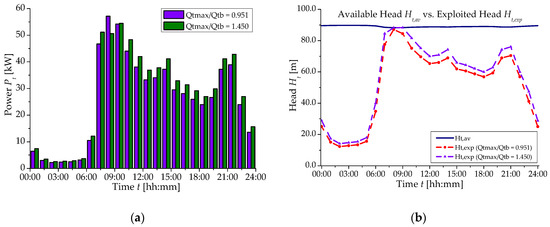 For both Scenarios, the maximum flow rate Qtmax was equal to 83.3 L/s, whereas the available head Ht,av at Qt,max was 18.30 m for Scenario 1 and 88.30 m for Scenario 2. In Scenario 1, the procedure was applied as per following steps, by first setting Qtmax/Qtb = 0.951 (Equation (7)) and then Qtmax/Qtb = 1.450 to maximize the produced power and the daily producible energy, respectively. Qt,max was achieved at 08:00.