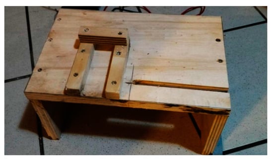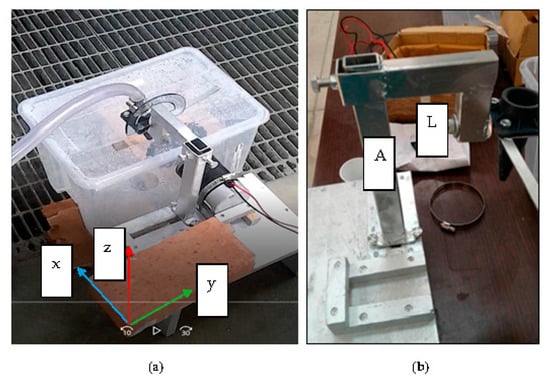 The steel section bar A (Figure 2b) of 30 × 20 × 260 cm size was connected to the T plate by welding and it is used as a translation pin z of the section bar 30 × 40 × 30 cm, which in turn is welded to the remaining L-shaped section bar. The lower part of the L-shaped section bar consists of a hole where there is a cylinder welded to a plate, allowing the nozzle to be positioned at a variable angle.