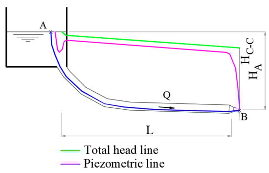 Given the gravity acceleration g = 9.81 m/s2, the cinematic viscosity υ = 1.006 × 10−6 m2/s, the pipe diameter D = 90 mm being the adopted value for the drainpipe, the diameter of the nozzle Dn = 9 mm yielding the contracted area AC-C computed with the measured contraction coefficient cc = 0.75, the Bernoulli’s theorem to the trajectory between a point A in the tank and a point B in the contracted section was used (Figure 4):