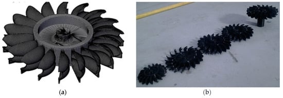 (a) Axonometric 3D view of the microturbine in the CAD environment. (b) Printed PLA turbines.