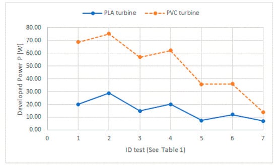 Power delivered in tests performed with the commercial turbine (PVC) and printed turbine (PLA).