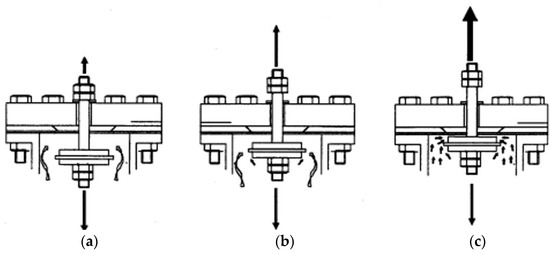 At the beginning of each cycle, the water coming from the tank reaches the impulse or clack valve (Figure 2) which is initially open (i.e., in the lower position, see Figure 2a) because of its weight, and the delivery valve is closed because of the overlying water column. At this stage, some water is released outside resembling a gush, this is the reason why it is also known as waste valve. Under the effect of the gravity, the water flowing in the drive pipe increase its own speed. When the hydrodynamic pressure force acting on the lower side of the impulse valve’s wins its weight, the valve starts lifting up at increasing speed (Figure 2b) and finally closes (Figure 2c), yielding a quick increase of pressure (onset of the water hammer).