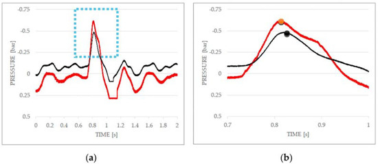 In order to detect the propagating celerity of the developed pressure waves, two transducers Trafag NAH 8253® were placed on the Supply galvanized steel pipe, 7.30 m long, nominal diameter DN 1” (25.4 mm). The following Figure 3a shows the pressure evolution trend for transducer #1 (red line) and #2 (black line). As can be noted by magnifying around the main pressure peaks (Figure 3b), a pressure dumping occurs when the pressure wave travels from the transducer #1 to transducer #2.