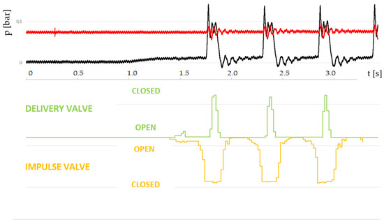 Correlation between valves opening and developed pressures at the delivery valve (red line) and the impulse valve (black line).