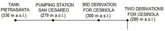The pipes forming the “New Aqueduct” are all in good conditions, except for the last part, from the manhole serving the two derivations for Cesinola to the Pietrasanta reservoir. This portion, sketched in Figure 3, is composed by the succession of steel pipes of diameters DN 450, 300 and 250 with an estimated roughness coefficient of ε = 0.7 mm.