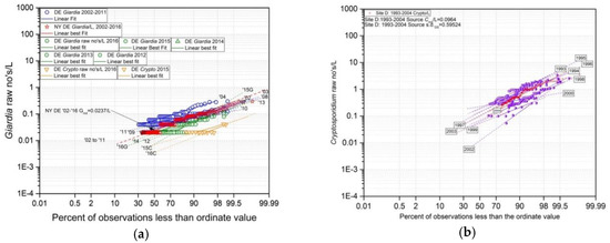 Cumulative frequency plots of C&G monitoring data: (a) 9 yearly records of Cryptosporidium measurements in 10 L river water samples (see Figure 1b,c); and (b) Giardia measurements in 50 L reservoir water samples from monitoring 2002–2016.