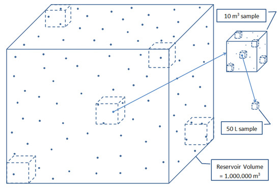 In the limited reports covering annual cycles, e.g., 12 months or multiples, data on levels of Cryptosporidium and/or Giardia typically consist of one or more, rarely more than 4–6, positive values and the remaining zeros, Figure 1a,b. A record comprised of more frequent measurements, as for example biweekly or weekly, over multiple annual cycles, Figure 1b, may reveal typical periods of higher and lower levels that less frequent sampling, Figure 1c, fails to show. If the same type of data are expressed in terms of a cumulative frequency plot, Figure 2a,b, it becomes clear that a data set, dominated by zeros, is simply truncated by the limit of detection that depends only on the recovery efficiency of the analytical procedure and the sample volume. This phenomenon has been shown to result from sample volumes and ambient concentrations that are in the same range as the limit of detection dictating that organisms are distributed according to the skewed Poisson model [16] The Poisson distribution effect on sampling and resulting data is easily illustrated, Figure 3, but poorly understood. In any well-mixed surface water, e.g., reservoir, a large volume, e.g., 106 m3 (ca. 2.5 MG), at a low oocyst or cyst concentration, e.g., 10/m3 or 0.01/L, the total in the 106 m3 will be 107 organisms, and they will be normally (Gaussian) distributed through the reservoir taken as a whole. However, any 10 m3 subvolume will contain 100 organisms and if 50 L samples are collected at random from the 10 m3 volume half of the 50 L samples will not contain ANY organisms, because in 10 m3 are 200 × 50 L subvolumes but only 100 organisms. The Poisson distribution accurately describes this phenomenon and dictates that for true concentrations in the typical ambient range of 0.01 to 0.1/L, if sample volumes of only 10 L are analyzed and if the analytical recovery is 50%, the probability of not finding any organisms is >80% [16].