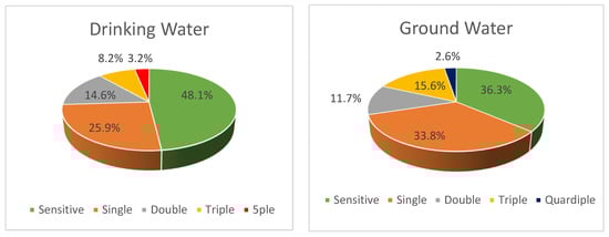 - Samra, Z.Q.; Naseem, M.; Khan, S.J.; Dar, N.; Athar, M.A. PCR targeting of antibiotic resistant bacteria in public drinking water of Lahore metropolitan, Pakistan. Biomed. Environ. Sci. 2009, 6, 458–463. [Google Scholar] [CrossRef]