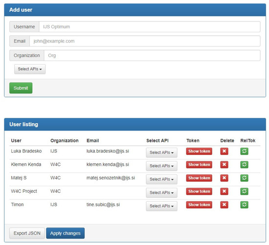 The service uses an online graphical user interface, accessible through the login screen, which allows the administrator to manage users and APIs. The user management section (see Figure 2) provides a form for adding new users, a list of existing users, their access rights and other information. Through this interface, we can also delete users, check their authentication tokens and select which API endpoints they can access.