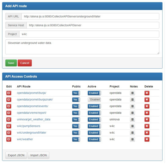 As seen in the bottom panel of Figure 3, users can view the list of APIs entered into the system. Here, it is also possible to delete APIs, check notes or edit API properties, such as URLs and project names on a case-by-case basis. Each API status can be set to private, meaning end users need authentication token and appropriate access rights to call this API, or public, also allowing anonymous users without tokens access to this endpoint as well. APIs can also be fully disabled, for example when underlying service is in maintenance mode or unexpectedly unavailable.