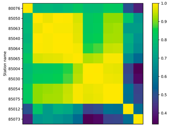 Correlation matrix of groundwater levels from different stations. Stations have been hierarchically clustered—similar stations are depicted nearby. We can observe 5 distinct clusters (similar types of rows) in the matrix, which represent 5 typical groundwater regimes. Two stations at the bottom deviate significantly from all others.