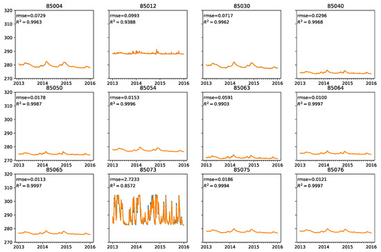 Real (blue) and predicted (orange) values of groundwater level at different stations. y axis presents groundwater level in meters above sea level, x axis represents time.