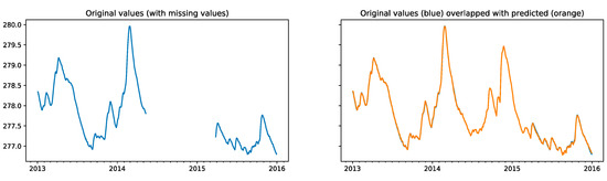 Prediction of missing values for sensor 85067, blue line (right) represents true values, orange line depicts groundwater level predictions over true measurements (right).