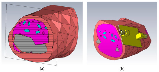 CST Microwave Studio models of the forearm. The salmon colored material is simulated as skin, the pink colored material represents muscles, grey is used for bones, red for arteries and veins and finally cyan for tendons. (a) Cross section of the model; (b) Resonator placed on the model.