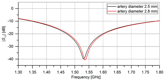 CST Microwave Studio Simulation results for the impact of different artery diameters on the resonance of the symmetrical split-ring resonator. In black: ∅artery = 2.5 mm. In red: ∅artery = 2.8 mm.
