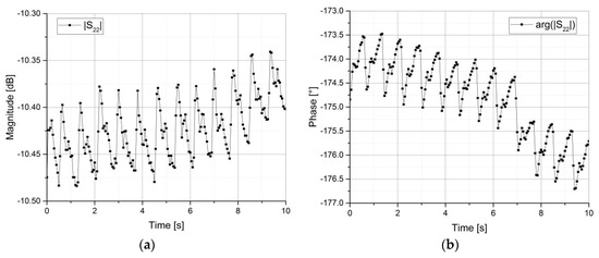 Then the settings were changed to a continuous wave sweep using the obtained resonance frequency. The sweep time was set to 5 s at first to check whether or not a heart rate was detectable. If it wasn’t, the resonator was moved to a slightly different spot on the forearm and the procedure was repeated. Once a systematic pulse was found, the sweep time was increased to 10 s. These measurements were conducted for the magnitude and for the phase of the reflection coefficients S11 or S22. The results of two measurements can be seen in Figure 5a,b.