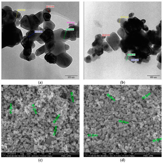 TEM images of the BST and 3 mol % MgO-BST nanocomposites are illustrated in Figure 1a,b. Average particle size of the powder samples was obtained from processing of the pictures and lists in Table 1. Analysis provides a good correlation between the calculated crystallite sizes (XRD) and particles. Morphologies demonstrate agglomeration of the smaller roundish particles as MgO on the surface of BST particles (Figure 1b). FESEM photographs of the films surface are seen in Figure 1c,d. Average grain size of the samples from 150 points measurement are provided in Table 1. Addition of MgO doping agents led to a slight increase of grain size. Specific surface area, pore volume and radius of the nanocomposites based on surface area analyzer are listed in Table 1.