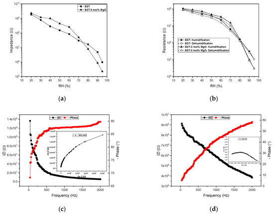 Sensitivity as total impedance change of the sensors shows in Figure 2a. MgO added BST with more than four orders of magnitude change exhibits higher sensitivity. Figure 2b shows hysteresis characteristics as resistance change of the sensors which is 6.1 RH% and 6.8 RH% for the doped and pure BST sensors, respectively. BSTM3 with response time of 30 s showed faster response than the BST with 41 s. Bode and Nyquist plots based on the complex impedance spectra at different RH levels confirm that sensors operate based on the protonic conduction mechanism (Figure 2c,d). Sensor contains of BST added 3 mol % MgO exhibits remarkable improved humidity sensitive performance for almost all humidity ranges compared to that contains of pure BST.