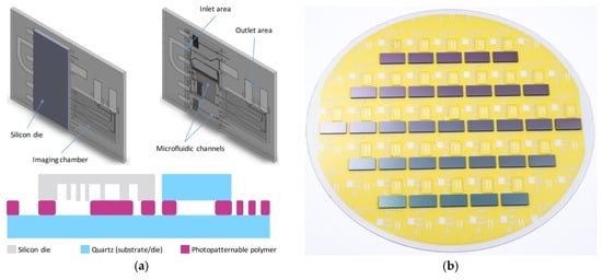 (a) Device schematics. (Top) 3D view of the main system components. (Bottom) Microchip cross-section view; (b) Image of the 200 mm wafer populated with silicon and quartz dies.