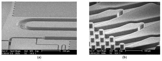 The adhesive bonding interface is provided by coating a 200 mm quartz wafer with a photopatternable polymer. A bottom antireflective coating layer is used to provide a correct lithography exposure over the 30 microns thick resist. The microchannels patterned into the polymer provide a fluidic link between the silicon and quartz bonded chips that will be later bonded. Conventional G-Line lithography is used to define a microchannels network on a <100> 200 mm silicon wafer in combination with a silicon Nitride/Oxide hard mask process. The silicon is etched by means of Bosch process into different depth, to provide multiple device functionalities (valves, timing channels). The silicon is finally diced into 1 cm × 1.8 cm dies. In parallel, a bare quartz wafer is also diced in 0.5 cm × 0.8 cm dies. The silicon chip and the photopatternable polymer are shown in Figure 2a,b. The final device assembly happens into an industrial BESI die to wafer bonding tool. After bonding and curing of the adhesive polymer layer, the devices are coated with 3[Methoxy(polyethyleneoxy)propyl]trimethoxysilane using a vapor-phase process to render the surfaces of the adhesive polymer, quartz, and silicon hydrophilic (i.e., suitable for capillary-driven flow).