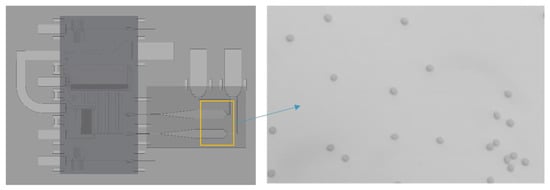 Schematic of the chip with details of the imaging chamber area. Red Blood Cells are clearly visible in the imaging chamber area (zoom on the yellow square).