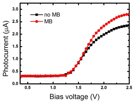 Photocurrent versus bias voltage for area with and without magnetic beads.