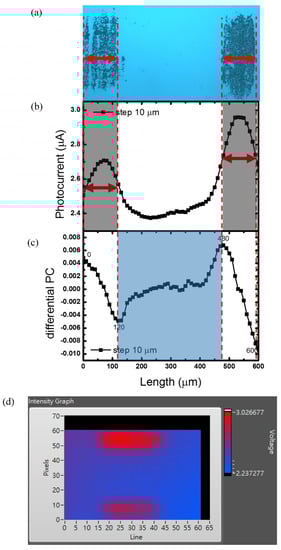 (a) OM picture of attached magnetic beads, (b) photocurrent versus X-coordination curve. Gray area could be referred to area with magnetic beads. (c) differentiated photocurrent versus X-coordination curve. Blue area could be referred to area without magnetic beads. (d) 2D images directly measured from selfdeveloped LabVIEW program.