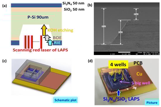 A new LAPS device structure is fabricated as shown in schematic and SEM picture in Figure 1a,b by the detail process flow shown in previous literature [8]. A double-side polished P-type silicon wafer is started with thickness of 300 μm. Thermal growth SiO2 and Si3N4 by low-pressure chemical vapor deposition (LPCVD) both with thickness of 50 nm were deposited on the both side of Si wafer. Then back side of Si was selectively etched by a sequence of dry and wet etching to the thickness of 90 μm by the patterns transferred from standard photolithography process. Si3N4 layers are used as the sensing membrane on the top side and the hard mask layer on the back side during KOH wet etching. To test the multi-well monitor, a special PDMS container is fabricated as the design shown in Figure 1c. Finally, this container could be fixed on Si3N4 surface of LAPS after O2 plasma treatment. 4 wells in the bottom layer and 1 big well in the top layer are used for cell culture and for LAPS measurement, respectively. An epithelium cell line in proximal tubule of pig’s kidney, LLCPK1, is cultured directly on LAPS. As shown in Figure 2, a portable system of FPGA-based LAPS embedded with self-designed incubator is used to perform experiments. Temperature and humidity could be controlled by PID controller, which is similar to commercial incubator. To avoid contamination during cell culture, FPGA-based LAPS system is fully sealed and fixed in this self-design incubator.