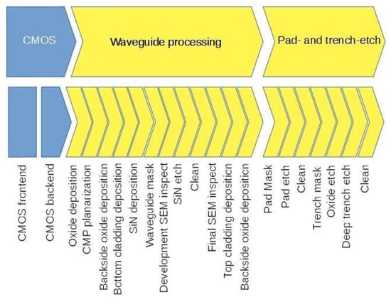 All wafers presented in this work were processed at ams’ FAB-B in Premstaetten, Austria. For the development of the waveguides and photonic structures, short-loop wafers without CMOS were prepared. These post-processing steps are fully compatible with CMOS processing and an overview of this process flow (indicating full CMOS integration) is given in Figure 1.