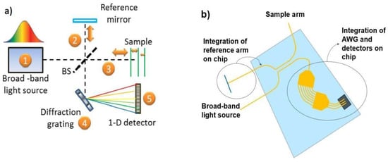 Schematic of a spectral-domain OCT system (a) as of today including broad-band light source, beam-splitter, reference- and sample-arm, diffraction grating, and detector. In our work (b) the beam-splitter, reference arm, grating (AWG), and detectors are integrated on a PIC.