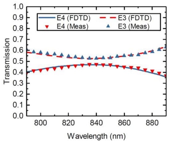 Measured results and predicted values by 3D FDTD simulations for the wavelength dependence of the splitting ratio of a broadband 2 × 2 coupler designed for 50:50 splitting ratio at 840 nm (TE-like polarization).