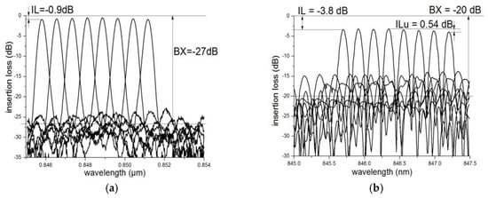 Simulated (a) and measured (b) spectral response of an 8-channel AWG (from []).