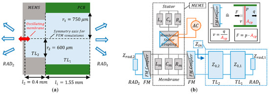 We consider the novel MEMS microphone presented in [4] which is attached to a printed circuit board (PCB) for convenient characterization of the system behavior (see Figure 1a). Due to the peculiar design of the microphone, which is based on an interdigitated finger capacitive readout between a movable membrane and a counter electrode called stator, we assume that only the sensing membrane is strongly interacting with the surrounding air. The cavity of the device and the hole in the PCB form a circular acoustic channel, which can be modeled by two acoustic transmission lines 𝑇𝐿1 and 𝑇𝐿2. When oscillating, the membrane generates sound waves on the PCB side (RAD1) and on the MEMS side (RAD2). This modeling approach captures both, the effects related to the propagation of sound waves and the impact of acoustic high-frequency effects. The presented system topology can be elegantly translated into the multi-energy domain equivalent circuit shown in Figure 1b by applying the modeling framework of generalized Kirchoffian networks [5].